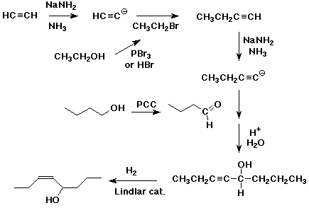 12. (15 points) Write out a sequence of reactions that could be used to accomplish one of the following conversions. Show the necessary reagents and conditions for each reaction step, but do not show mechanisms. As starting materials you may use acetylene, any alcohol that has four carbons or fewer, plus any needed solvents or inorganic reagents. JUST DO ONE OF THE TWO.