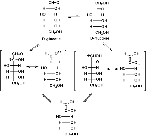 13. (15 points) Glucose can be converted to fructose via a common enol. Write the structure of the enol and two different enolate anions.