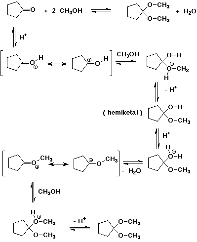 8. (15 points) Write a complete mechanism for the acid-catalyzed addition of methanol to cyclopentanone to form 1,1-dimethoxycyclopentane. Show all steps and show all resonance forms for any intermediates involved.