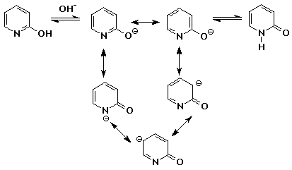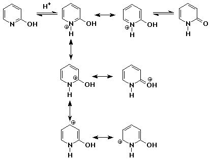 7. (15 points) Pyridone, shown below, has two tautomeric forms that can be interconverted by either acid or base. Write the intermediate for each case with all resonance forms.