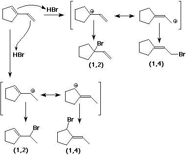 3. (3 points) The diene below could give four possible addition products with one equivalent of HBr. Identify the two most likely intermediates and the four possible products, allowing for both 1,2- and 1,4-additions.