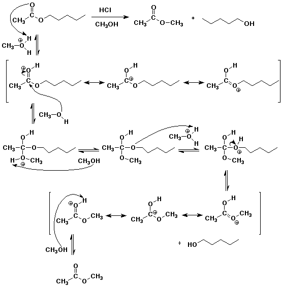 6. (20 points) Write a complete mechanism for the acid-catalyzed transesterification that converts pentyl acetate to methyl acetate by heating in acidic (HCl) methanol solution.