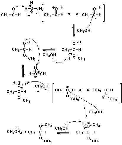 3. (4 pts) Write a complete mechanism for the acid-catalyzed formation of the acetal of acetaldehyde in methanol solution. Show all steps, all resonance forms for any intermediates involved, and electron-pushing arrows.