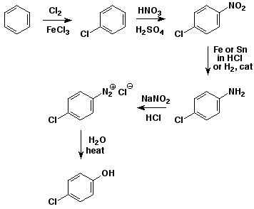 3. (4 pts) Show a sequence of reactions that could be used to make p-chlorophenol starting with benzene.