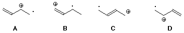 114. Consider the radical cation that would result from removal of one electron from 1,3-butadiene. All of the following are reasonable resonance forms EXCEPT B
