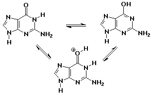 4. (10 points) Write the keto and the enol forms of guanine, and indicate the protonated form that could serve as an intermediate between them.