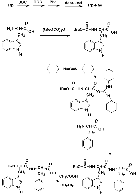 5. (15 points) Illustrate the steps in a synthesis of the dipeptide TrpPhe, assuming that the pure amino acids are available, along with BOC as a protecting agent and DCC as a coupling agent. For full credit, show all structures used in each step.