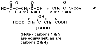 2. (2 points) Citrate is biosynthesized as shown below. Identify the likely source of the six carbons of citrate by numbering them on the precursors.