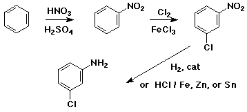 6. (15 points) Write a complete synthetic sequence to illustrate how you could prepare either one of the compounds below starting with benzene.