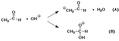 7. (15 points) Hydroxide ion could react with acetaldehyde (shown below) in two different ways.