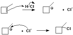 2. (3 points) Write a complete mechanism for the addition of HCl to 1-methylcyclobutene. Show all steps and all intermediate structures, including electron-pushing arrows.