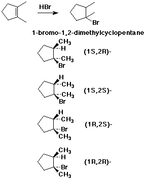 2. (4 points) The addition of HBr to 1,2-dimethylcyclopentene gives a mixture of stereoisomeric products with two stereocenters. Show the reaction and give the names and structures for the four possible stereoisomers.